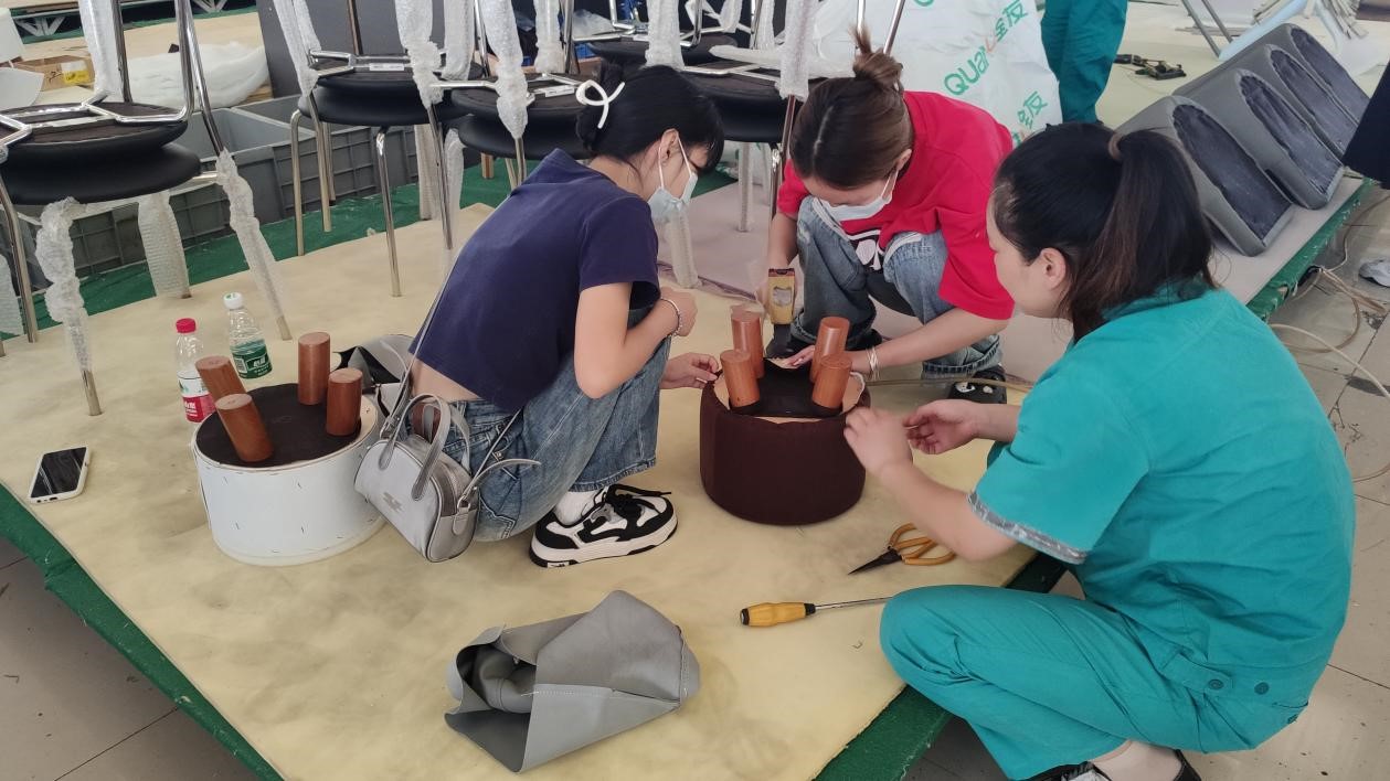 在实践过程中,员工们亲身体验了软体家具完整生产流程,动手参与小圆凳扪皮工艺的实操环节,深刻体验了全有从“0”到“1”的设计理念,并跟随指导老师细致参观家具生产车间,而后员工亲手进行了实木餐桌椅的安装与拆解操作。通过实训使员工们能更加全面理解家具行业与产业,有效提升员工在家具材料认知、工艺结构设计以及设计创新等方面的能力。