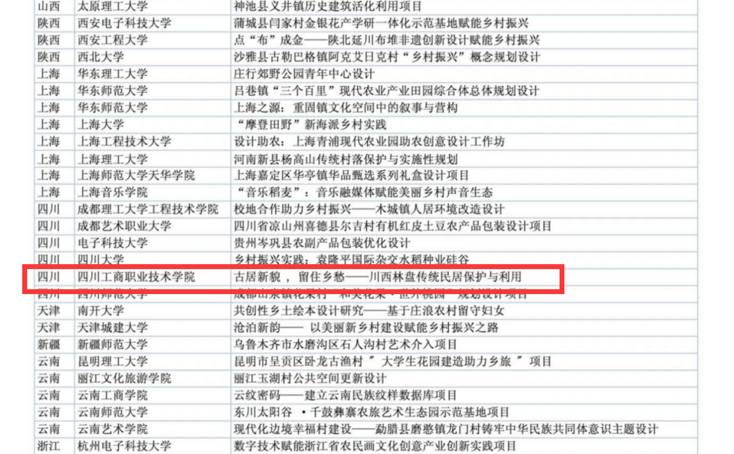 304永利集团教师陈卓、张剑老师指导环艺21350班陈皎等同学项目化课程作品《古居新貌,留住乡愁—川西林盘民居保护与利用》入选由未来设计师大赛组委会和民政部直管智惠乡村志愿服务中心联合举办2023第二届“全国高校设计赋能乡村振兴创新案例”。本次活动于2023年12月18日开始,2023年12月31日截止,共收到公司自愿申报的512个案例,经过多轮评审,其中的150个案例入选。鼓励高校设计学科赋能乡村振兴,发挥学科竞赛“立德树人”功能,得到“学习强国”学习平台,人民网,新华网,半月谈等媒体的报道和展播,引起很大的社会反响。
