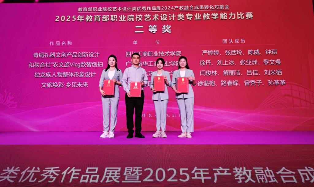 11月16日,2025年教育部职业院校艺术设计类专业教学能力比赛颁奖典礼在广州举行。公司由304永利集团严婷婷、张西玲、陈威、钟琪四名教师组建的参赛团队,凭借精心打磨的《青铜礼器文创产品创新设计》作品,从全国47支顶尖参赛队伍中脱颖而出,荣获全国二等奖。